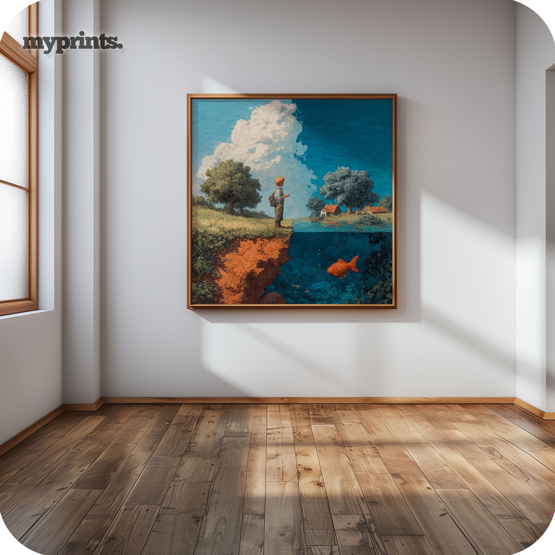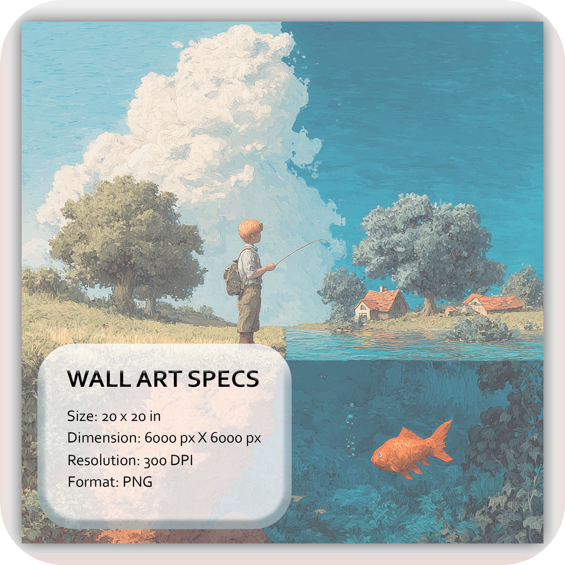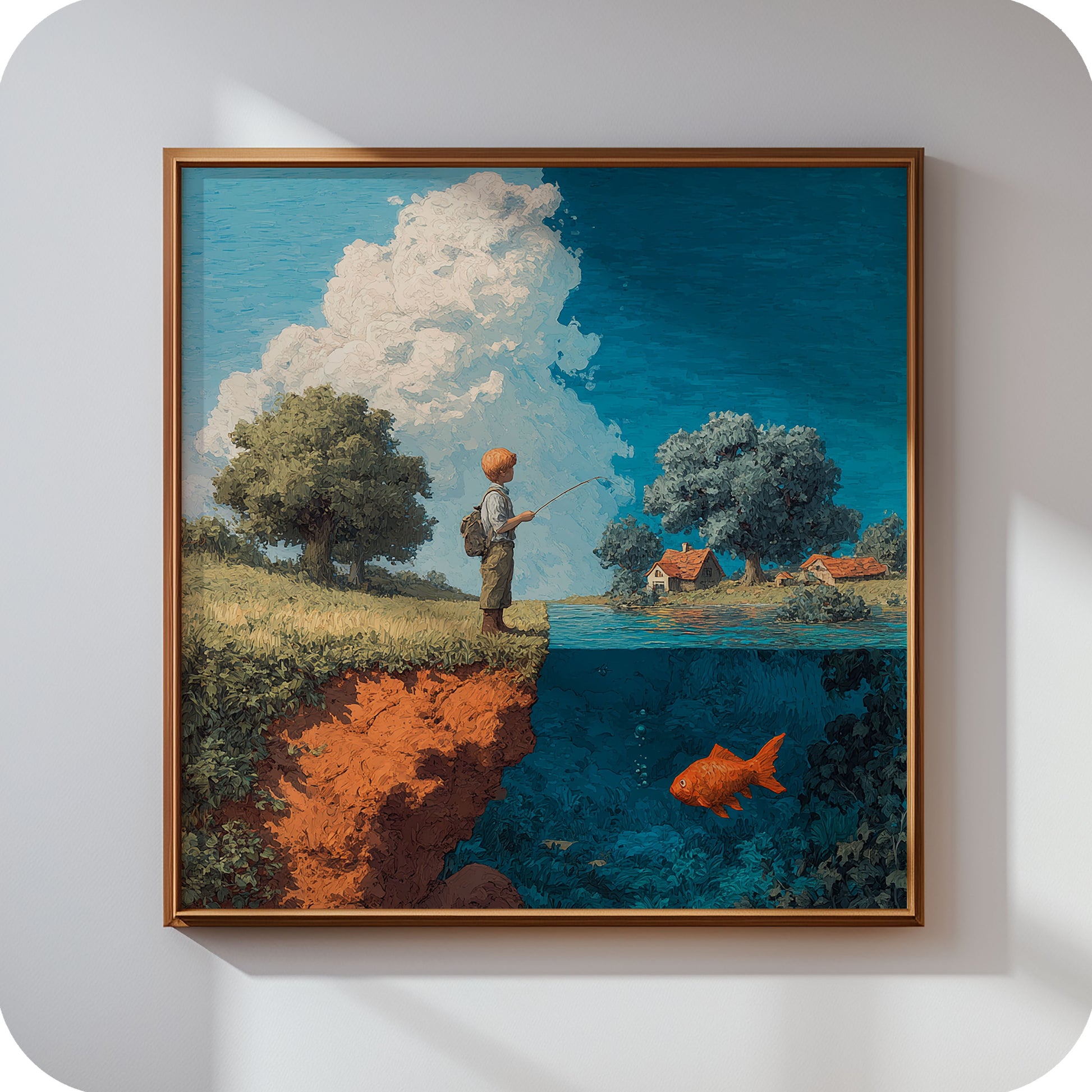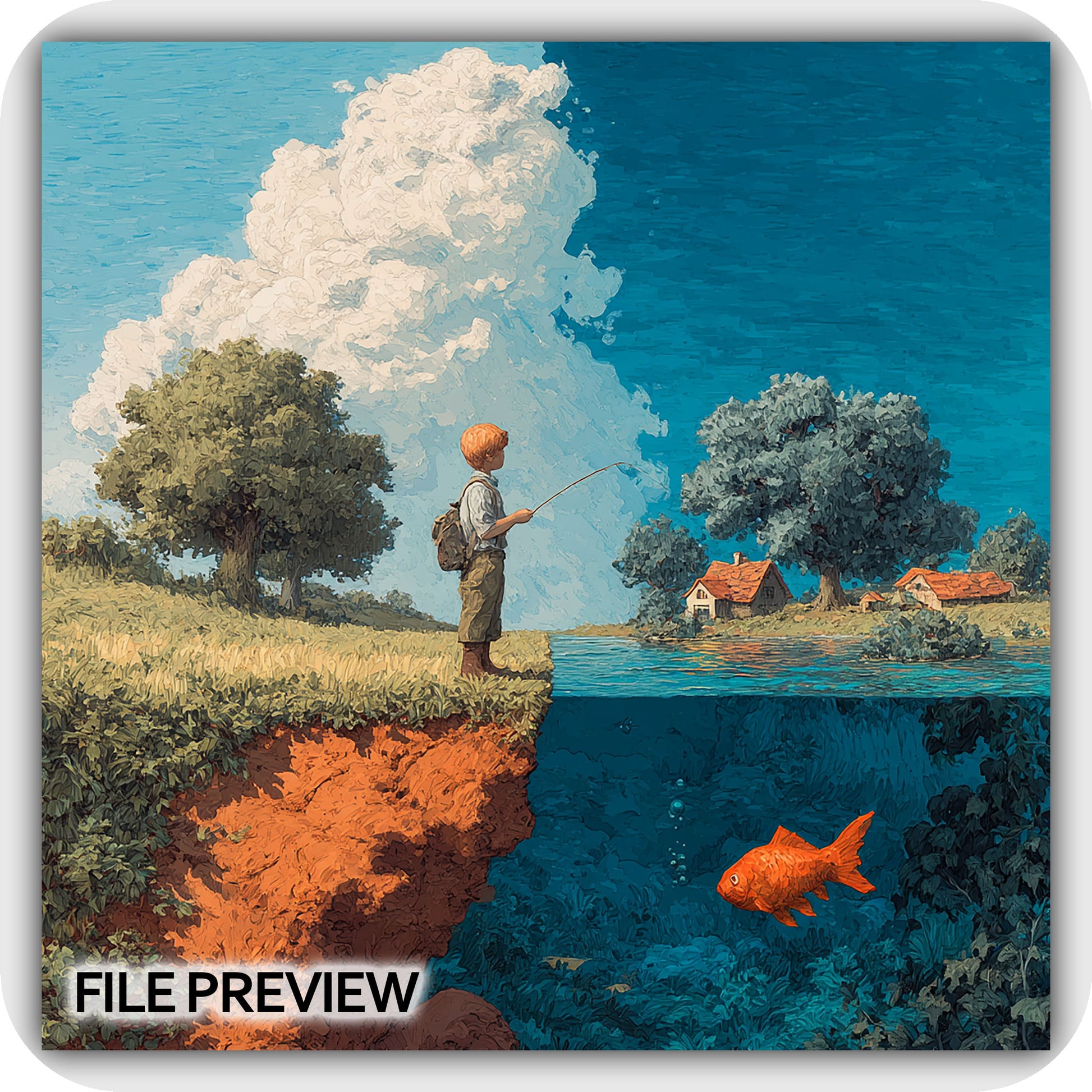 Wall Art Digital Download that captures a surreal moment of balance between land and water. This dreamlike scene features a quiet figure standing at the edge of a divided landscape, where grassy earth meets a tranquil underwater world filled with glowing orange fish. The soft clouds, calm blues, and warm earthy tones create a sense of wonder and reflection, making it a perfect piece for modern, serene, or imaginative interiors.