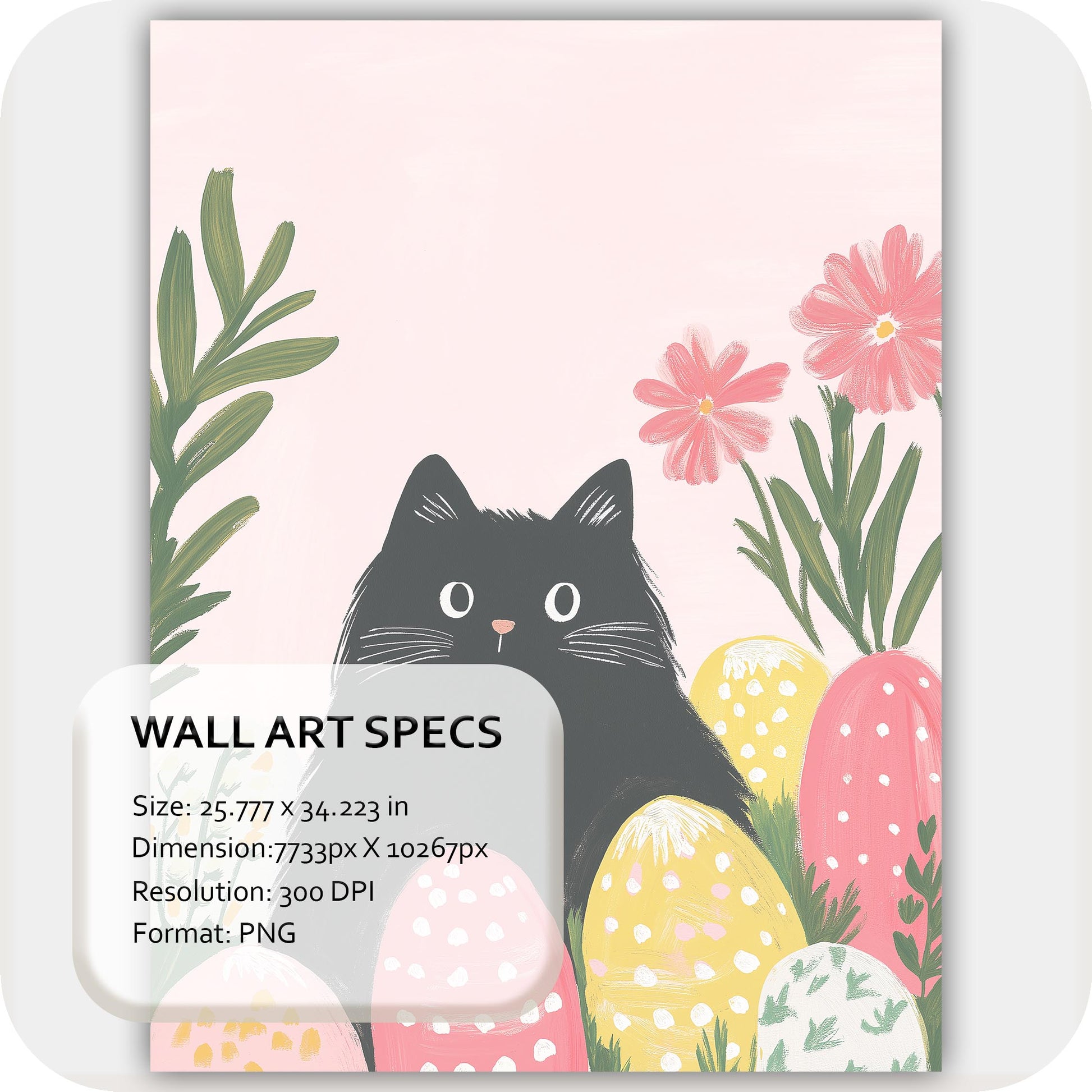 Wall Art Digital Download that captures the whimsical charm and playful spirit of a curious cat. Black Cat Bloom features a beautifully painted black cat nestled among vibrant flowers and patterned vases, set against a soft pink background — a piece that radiates modern charm and cheerful energy. Perfect for cat lovers and fans of modern illustration alike, it adds a playful and artistic touch to living rooms, bedrooms, nurseries, or home offices.