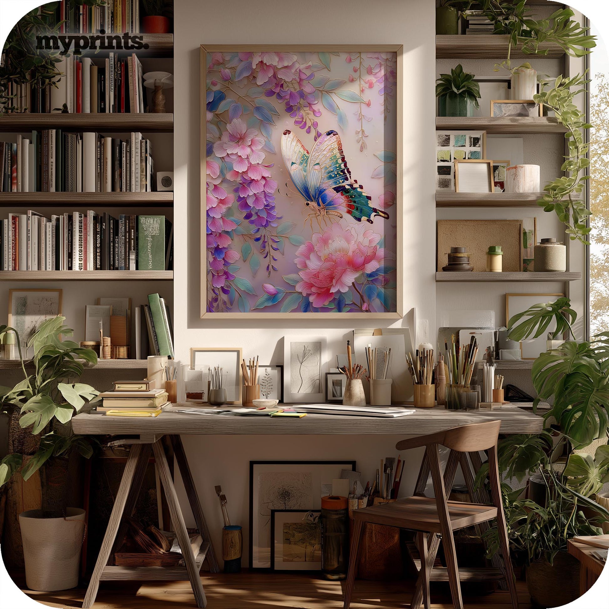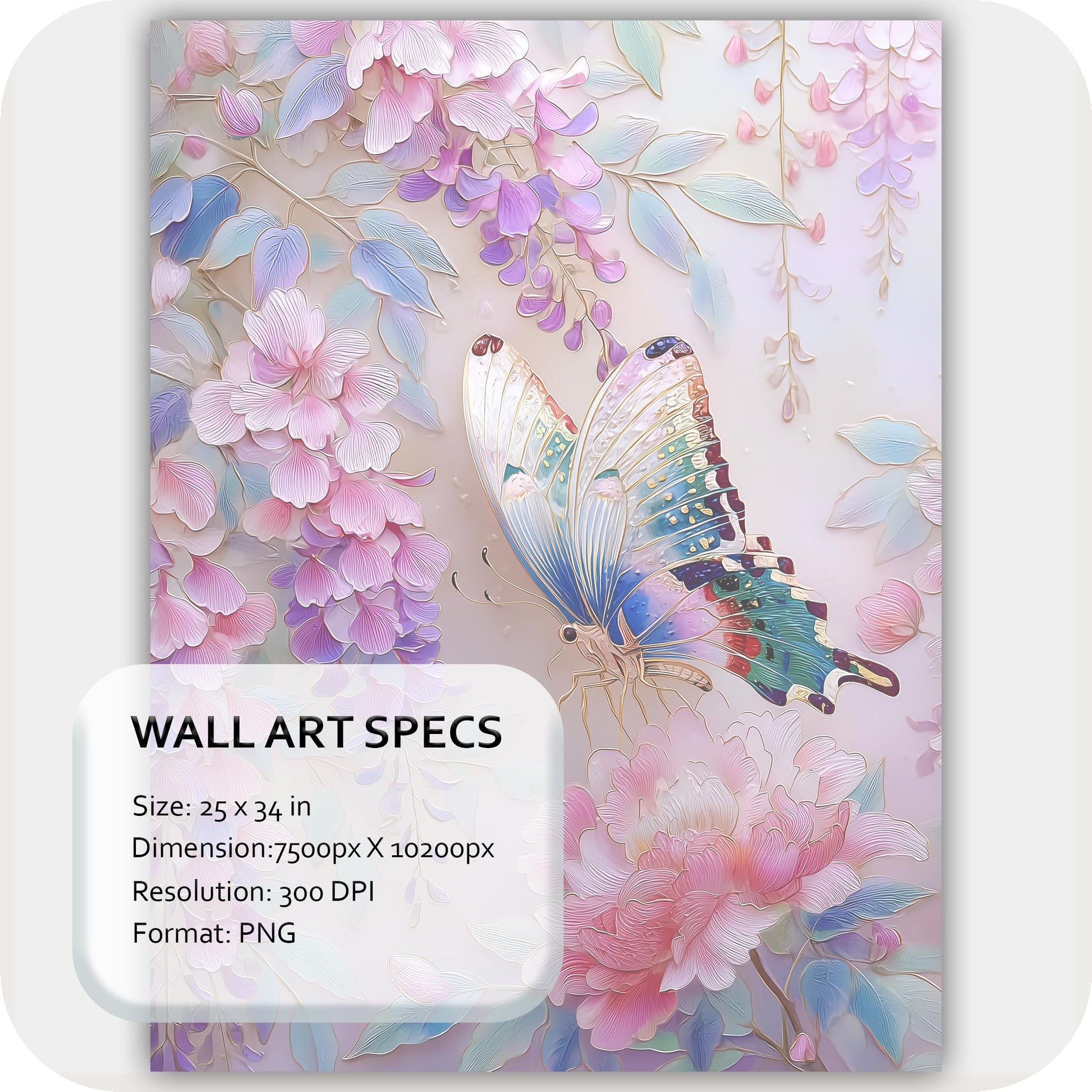 Wall Art Digital Download that embodies elegance and ethereal grace. Butterfly Whispers captures the delicate beauty of a butterfly resting gently on vibrant, blooming florals — a symphony of soft pastels, vivid pinks, and rich greens. Its serene tones and detailed artistry bring whimsy, sophistication, and tranquility to any interior.