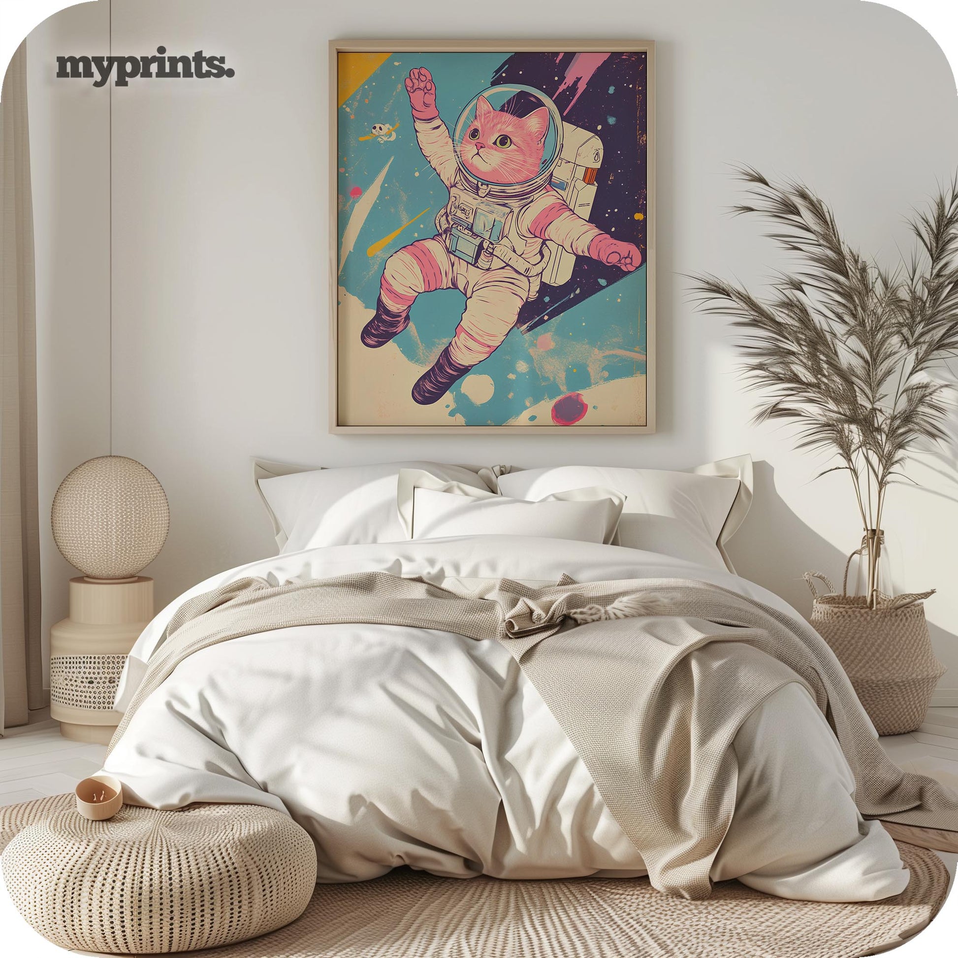Ideal for bedrooms, creative studios, or modern interiors that need a pop of color and character. This vibrant design brings a lighthearted cosmic twist to your walls, making every glance feel out of this world.