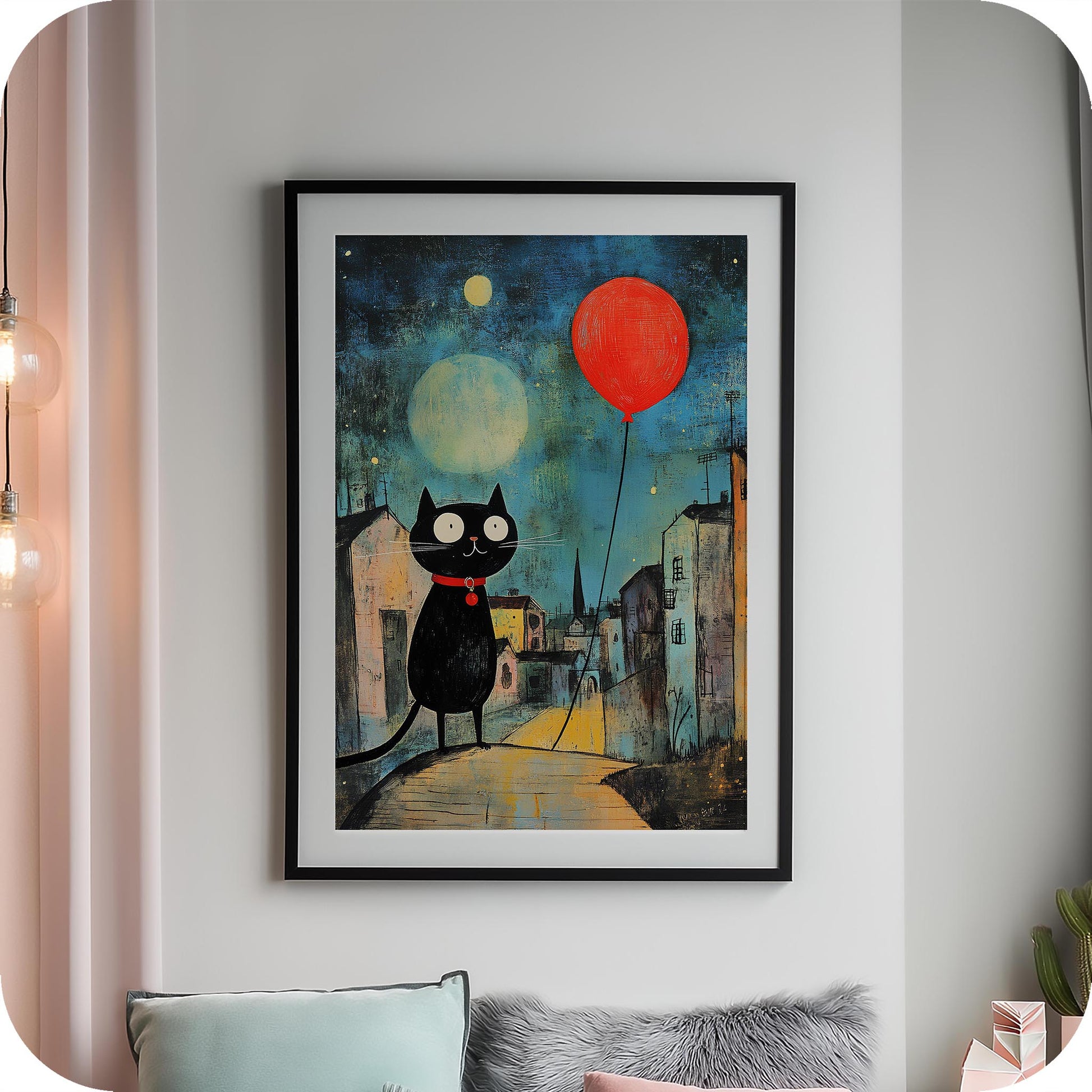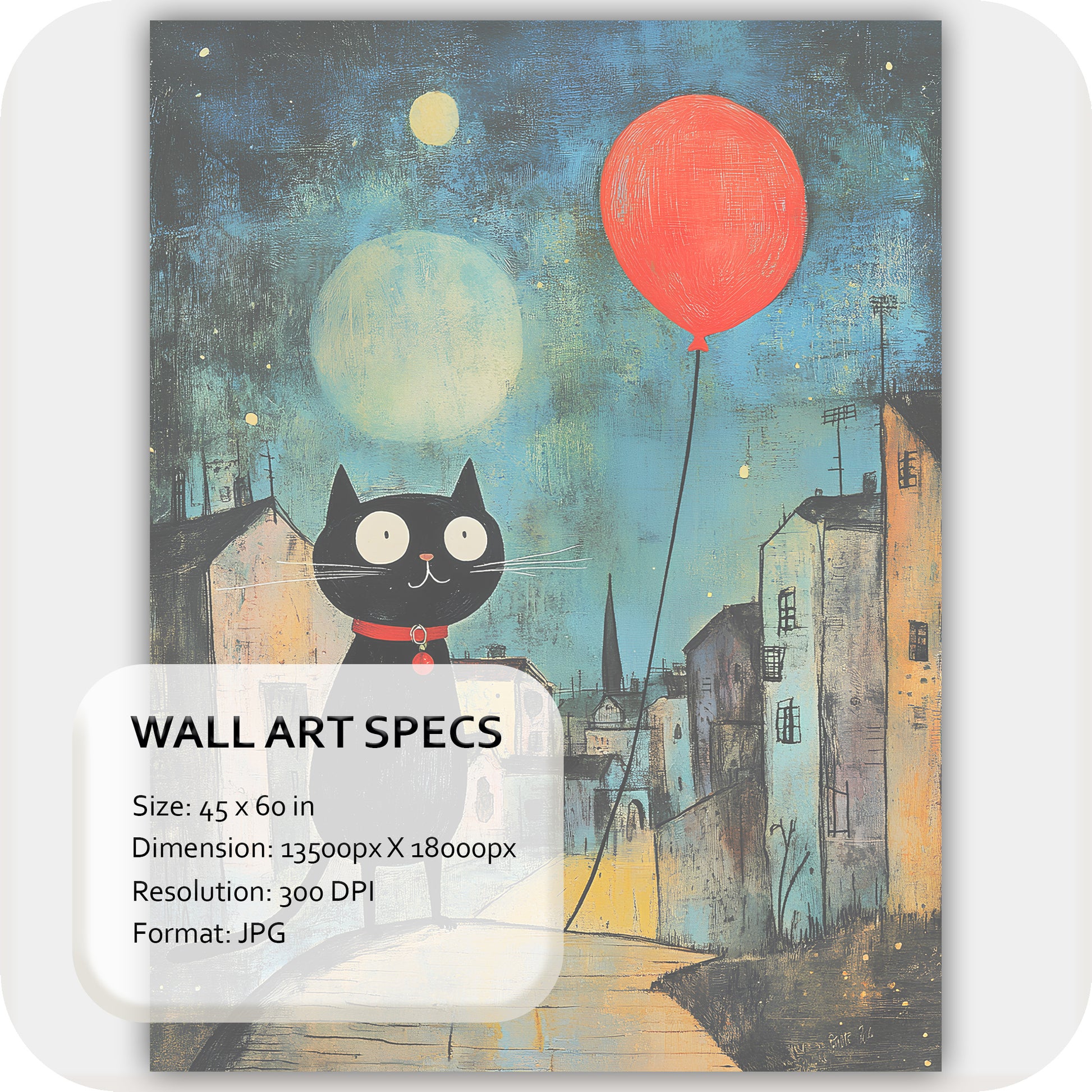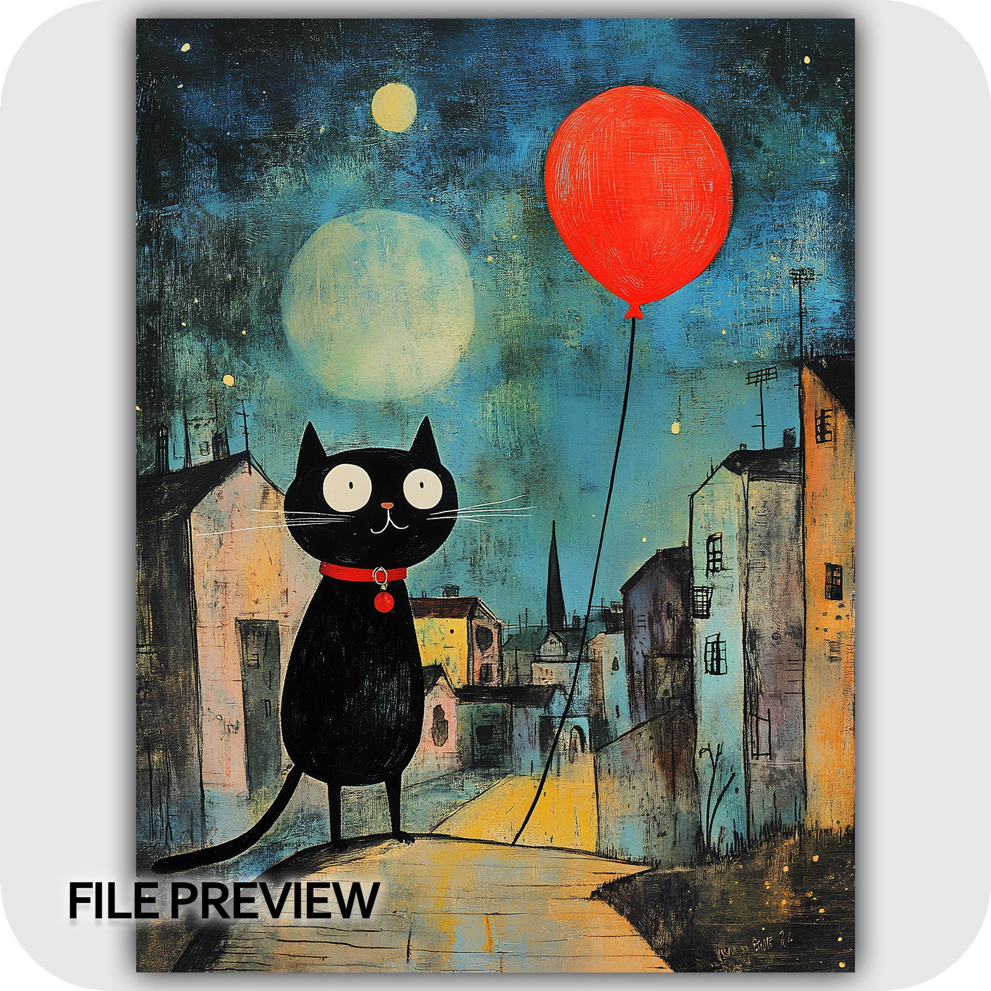 Wall Art Digital Download that captures an enchanting nocturnal tale filled with quiet charm and imagination. Midnight Whiskers showcases a curious black cat holding a vivid red balloon, wandering through a softly lit street under a dreamy moonlit sky. This artwork radiates whimsical storytelling and gentle magic — perfect for cat lovers and admirers of narrative-inspired art.