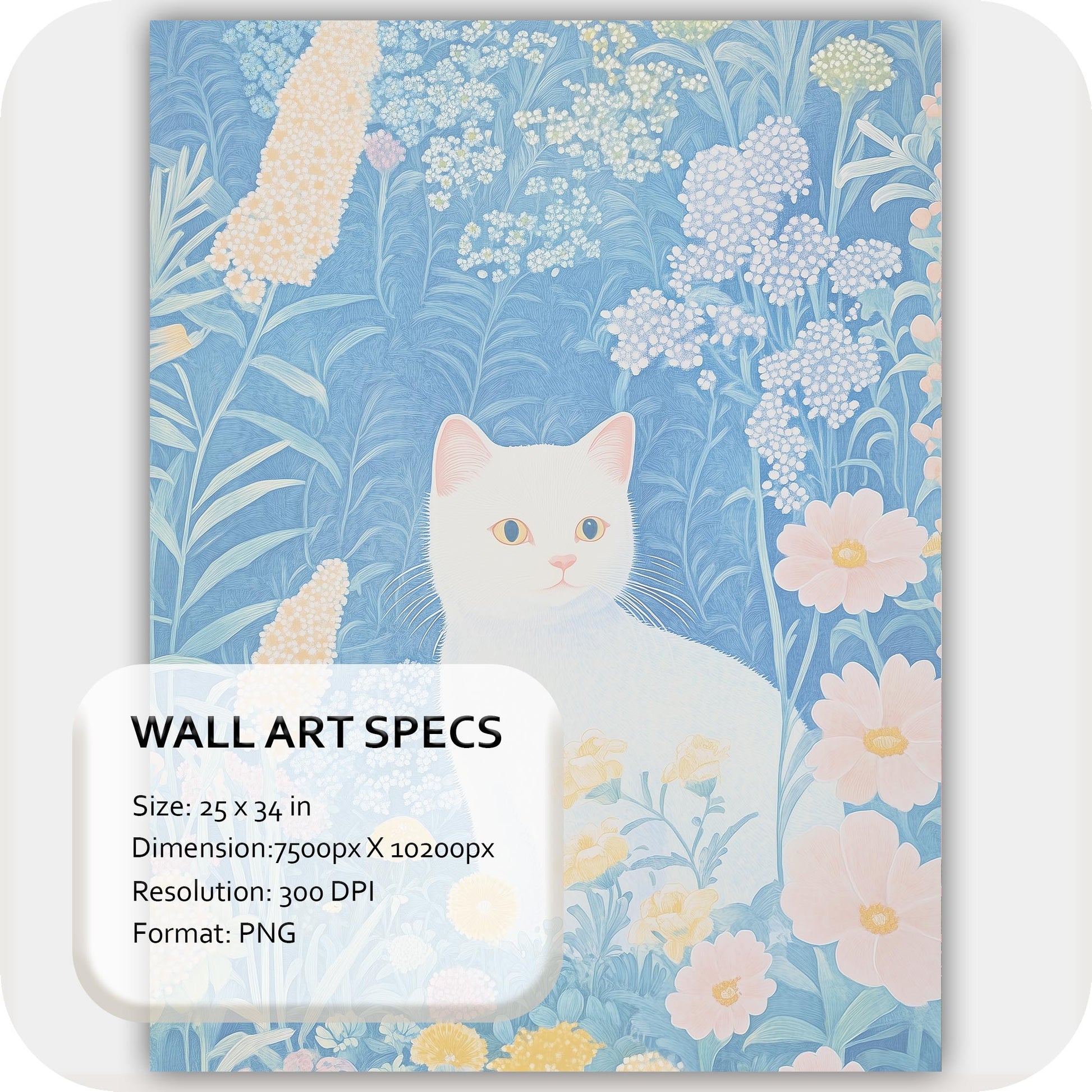 Wall Art Digital Download that brings serene beauty and gentle charm into your space. Pastel Bloom Feline features an elegantly painted white cat, gracefully poised amidst delicate pastel florals and whimsical botanical elements, all set against a tranquil blue background — a piece that radiates calmness and artistic grace. Perfect for cat enthusiasts and those who appreciate subtle beauty, it adds a soothing and stylish touch to living rooms, bedrooms, nurseries, or tranquil reading nooks.
