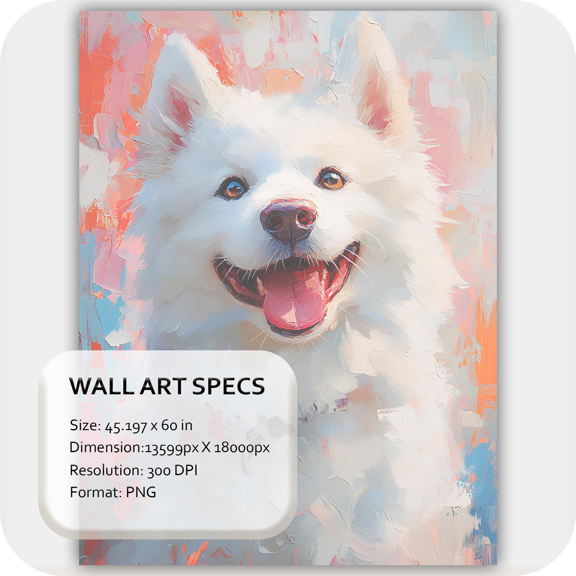 Wall Art Digital Download that captures the joy and warmth of a beloved companion. Radiant Pup features a beautifully painted white dog beaming with happiness, surrounded by soft pastel hues of coral and blue — a piece that radiates positivity and charm. Perfect for pet lovers and modern spaces alike, it adds a heartwarming touch to living rooms, bedrooms, or cozy reading corners.
